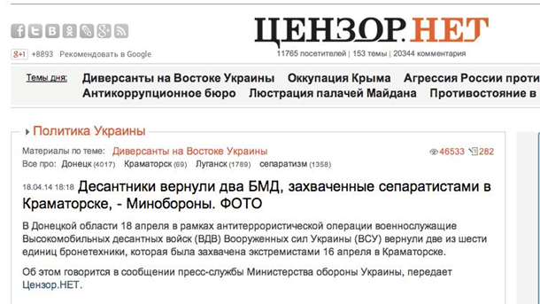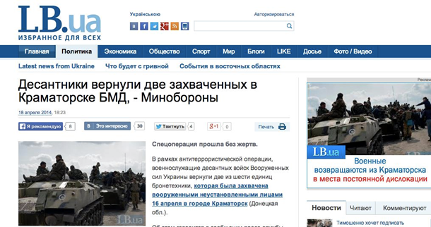 «В Донецкой области 18 апреля в рамках антитеррористической операции военнослужащие Высокомобильных десантных войск (ВДВ) Вооруженных сил Украины (ВСУ) вернули две из шести единиц бронетехники, которая была захвачена экстремистами 16 апреля в Краматорске.