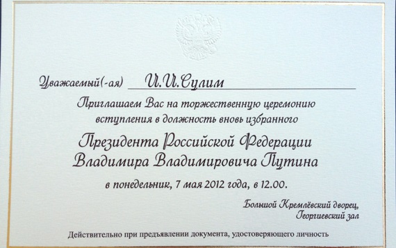 На "торжественную церемонию вступления в должность вновь избранного Президента РФ Владимира Путина" приглашали гостей в 2012 году.