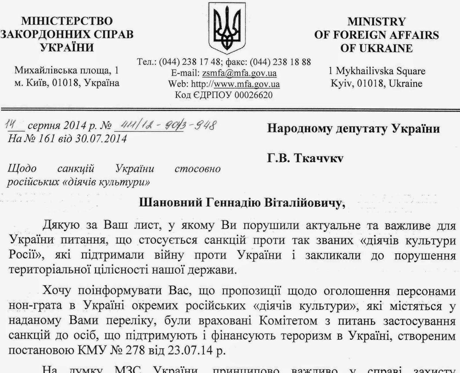 МЗС поінформувало, що пропозиції щодо оголошення персонами нон-грата в Україні окремих російських «діячів культури», які містяться у наданому мною переліку, були враховані Комітетом з питань застосування санкцій до осіб, що підтримують і фінансують тероризм в Україні, створеним постановою КМУ № 278 від 23.07.14 р. А Служба безпеки повідомила, що відповідно до законів України «Про правовий статус іноземців та осіб без громадянства» та «Про основи національної безпеки України» вже прийняте рішення про заборону в’їзду в Україну частині громадян РФ, які вказані у наданому мною списку, а рішення про заборону в’їзду в Україну іншим особам буде прийнято після проведення відповідної перевірки.