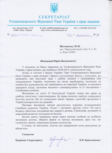 «Оснований для направления актов реагирования не усматривается» – пишет руководитель секретариата Б. В. Крикливенко, ссылаясь на свободу совести и семейные ценности. Перевожу дословно: «В соответствии со статьей 35 Конституции Украины каждый имеет право на свободу мировоззрения и вероисповедания. Это право включает свободу исповедовать любую религию или не исповедовать никакой. Церковь и религиозные организации в Украине отделены от государства. Вопрос воспитания ребенка регулируется нормами, установленными Семейным кодексом Украины. В соответствии с частью второй статьи 150 этого Кодекса обязанность заботиться о здоровье ребенка, его физическом, духовном и моральном развитии возложена на родителей. Родители имеют преимущественное право перед другими лицами на личное воспитание ребенка, выбирать формы и методы воспитания, кроме тех, которые противоречат закону, моральным основам общества». По вопросу о антисанитарии, кстати, ни слова.
