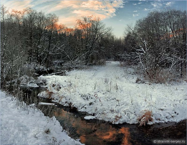 тепло-оранжевый свет. От деревянных изб деревни , от старых деревьев на