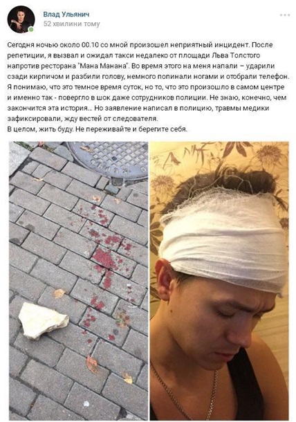 "После репетиции, я вызвал и ожидал такси недалеко от площади Льва Толстого напротив ресторана "Мана Манана". Во время этого на меня напали – ударили сзади кирпичом и разбили голову, немного попинали ногами и отобрали телефон", - написал он. Певец уже написал заявление в полицию, а медики зафиксировали нанесенные ему травмы.