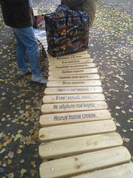 Пару недель назад местные СМИ сообщили, что на этой лавочке, рядом со словами Шевченко появились похабные надписи. Когда я пришел и сделал фото лавочки, надписи уже успели стереть.