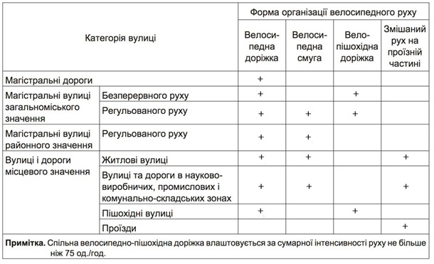 В зависимости от категорий улиц и дорог определяются соответствующие формы организации велосипедного движения в населенных пунктах: