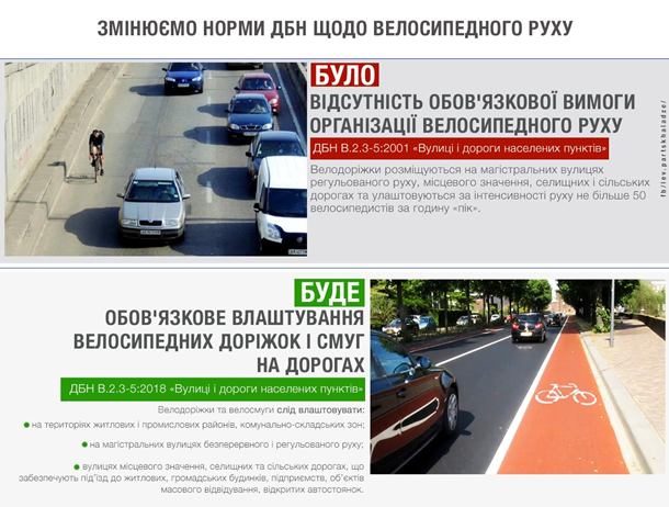 Согласно обновленному ДБН «Улицы и дороги населенных пунктов» проектирование велодорожек стало обязательным условием при строительстве, проведении реконструкции и капитальном ремонте дорог.