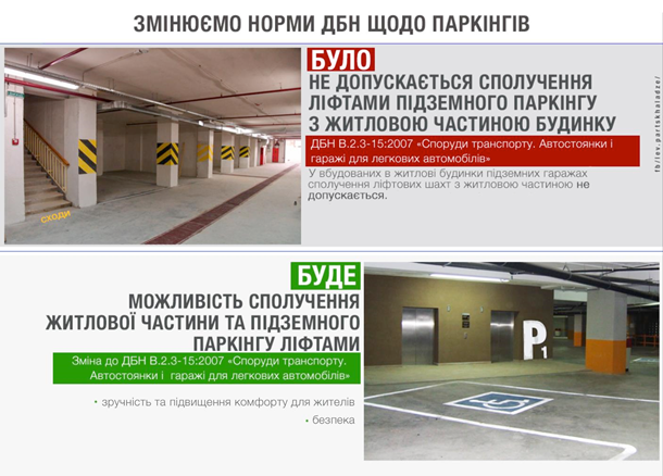 Випереджу тих, хто скаже: «не вигадуйте, у нас також будуються будинки зі зручними лифтами, які сполучають підземний паркінг і житлову частину». Так, але напевно ви не знаєте, що ті, хто хотів так проектувати, мусили вирішувати це питання через процедуру відхилення від ДБН, що досить ускладнювало процес проектування та затримувало будівництво. Або гірше – могли вирішували через корупційні зв’язки взагалі не узгоджуючи це.