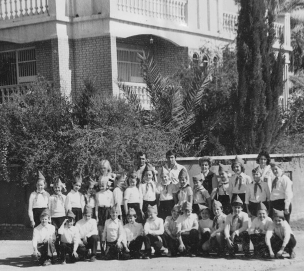 Уверен,на половину можно сразу надевать электронные наручники или вставлять чип GPS.Прямо в мозг.Или непосредственно,-в жопу. Шутки шутками,а я вот вспоминаю своё совковое детство и первый класс в обычной гоблинской школе из грязно-коричневого кирпича,в которой по переменкам бегают осатанелые от акселерации октябрятки...Итак,первый класс.У меня был первый Б.Б - значит Бандит (однозначно,-оптимальный вариант!)Первый В - значит Вор (немного хуже,но терпимо)Первый А - значит Алкоголик (Святая правда!)И это не мой стёб!-так мы себя называли!А как корабль назовёшь,так он и поплывёт...Проблема в том,что мне,после трёхлетнего прибывания в багдадской школе со второго по пятый класс в иракской республике имени Саддама Хусейна,-по возвращении на свирепую родину мне пришлось перекочевать из пятого класса Б в пятый класс В (по причине вынужденного и временного русскоязычия)И вот тут начались проблемы...Но вовсе не из-за русскоязычия...А из-за жёсткой семитской тусовки...Впрочем,это совсем другая история...Кто не верит,-смотрите фотки             А вот и фото... Утренник в школе номер один города Басры