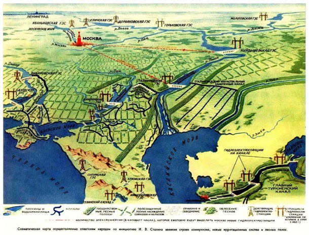 Для простоты это именовалось «сталинским планом преобразования природы». Было решено покончить с проблемой засухи путём посадки лесозащитных насаждений и создания систем орошения. План предполагал течение 15 лет (1950-1965 гг.) заложить леса на площади 5,7 млн га, это примерно с Хорватию. 3,6 млн га отводилось на силы и средства колхозов, 1,5 млн га нарезали Министерству лесного хозяйства СССР, которому предстояло заниматься малолесными районами и неудобьями. Остальное досаживали совхозы. В целом изменение климата предполагалось на площади 120 млн гектаров, это уже добрая пятерка европейских стран.