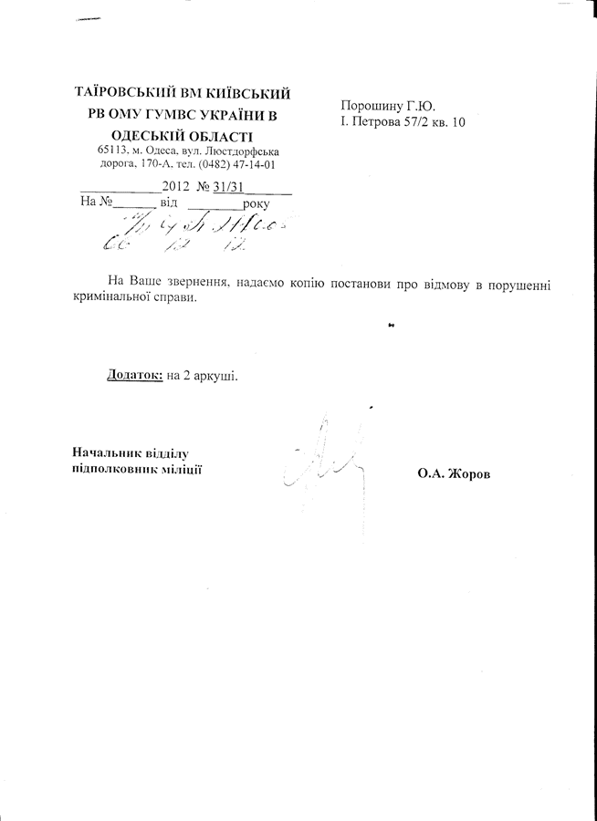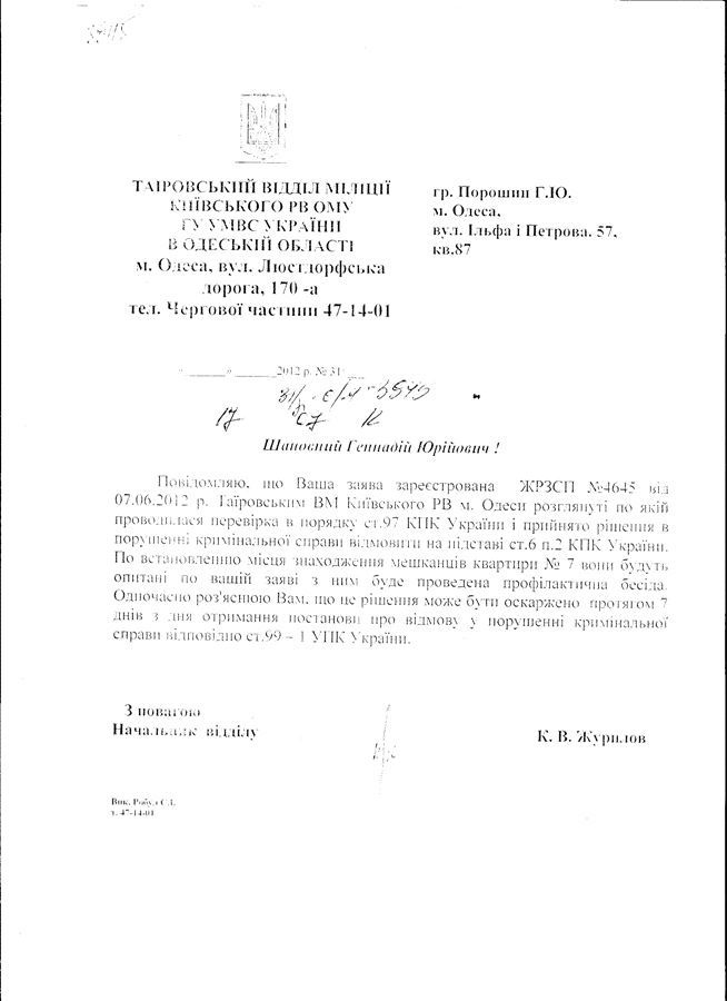 Заявление было принято. После чего была якобы предпринята проверка обозначенных фактов, результатом которой был… отказ. В письменном ответе на очередной запрос жильцов на основании ст.6 п2 КПК Украины было вновь отказано в возбуждении уголовного дела. Отказ мотивировался тем что ..местонахождение жителей злополучной квартиры не установлено.