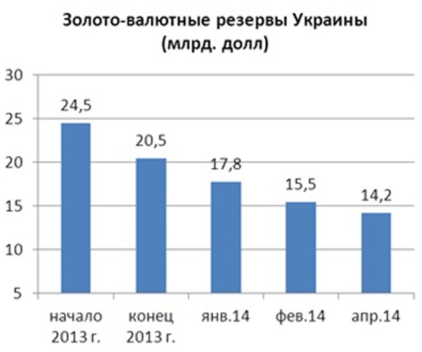 По данным Национального банка Украины, на конец 2013 года золотовалютные резервы составляли $20,5 млрд., а на конец апреля 2014 года они упали до $14,2 млрд. (Рис.1). Получается, что за первые четыре месяца 2014 года было истрачено $6,3 млрд. резервов. На начало прошлого года резервы были равны $24,5 млрд. Следовательно, Украина за год и четыре месяца потеряла $10,3 млрд. своих золотовалютных резервов. Если бы не российский кредит, то потери оказались бы на уровне $14 млрд.