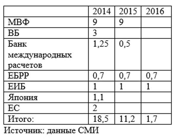 «Потолок» внешних финансовых вливаний от всех официальных кредиторов составит 18,5 млрд. долл в текущем году и еще 13,9 млрд. долл в 2015-2016 гг. (см. таблицу 2).