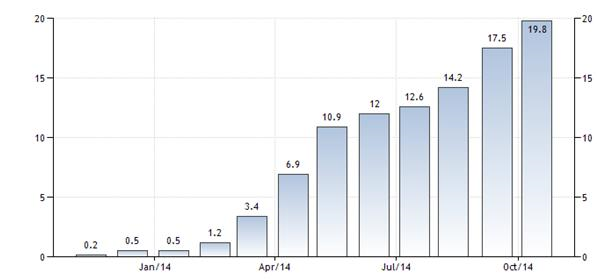 мы видим на графике, уровень инфляции в 2014 году достиг 19,8%. Об этом 6 ноября сообщила