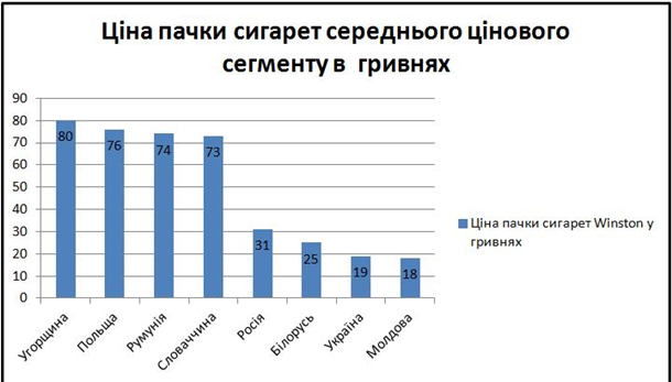 Експерти Українського центру контролю над тютюном проаналізували ціну на пачку сигарет середнього цінового сегменту в державах-сусідах і отримали наступні результати: Україна – 19 грн, Угорщина – 80 грн, Польща – 76 грн, Румунія – 74 грн, Словаччина – 73 грн, Росія – 31 грн, Білорусь – 25 грн, Молдова – 18 грн.