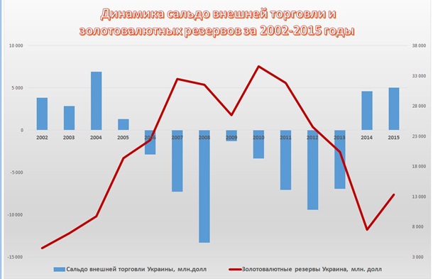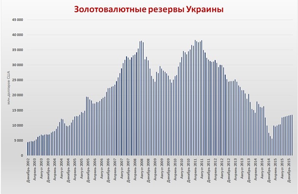 Мало, кто уже вспомнит, что на 1 января 2003 года золотовалютные резервы Украины составляли всего 4,6 млрд. долл. Сейчас это кажется мизерной суммой. Но уже через пять лет в 2008 году золотовалютные резервы Украины были 31,4 млрд.долл. Начиная с 2000 года в Украине фактически был регулируемый курс доллара. Девальвация гривны была, но небольшая. За период с 2001 по 2005 года гривна девальвировала по отношению к доллару с 5,2 до 5,33 грн за долл. А с 2005 года до 2008 года фактически был фиксированный курс доллара 5,05 грн. Как результат, золотовалютные резервы росли ускоренными темпами. Почему? Во многом потому, что фиксированный, или, точнее, контролируемый курс гривны, которая колеблется в течение года не больше, чем на 5%, всегда положительно влияет на экономику Украины. После кризиса 2008-2009 годов золотовалютные резервы опять начали расти, во многом потому, что курс гривны был относительно стабильным. Зато после 2013 года, когда в Украине появился псевдогибкий курс гривны, обвал гривны привел к тому, что золотовалютные резервы Украины упали на начало 2015 года до уровня 5 млрд. долл., что фактически означало возврат почти в 2002 год. Потом за счет кредитов МВФ золотовалютные резервы Украины выросли до 13,5 млрд. долл. Но проблема в том, что кредиты МВФ, это временная помощь, и их нужно отдавать. А это значит, что чистые золотовалютные резервы Украины на 1 марта 2016 года составляют всего 1,6 млрд. долл, в то время как на 1 марта 2013 года они были больше 16 млрд. долл. Вот это проблема из проблем. И во многом она образовалась по вине главы НБУ Валерии Гонтаревой, которая плохо понимает, что такое экономика Украины,а, тем более, финансовый рынок, а гибкий курс гривны в ее руках привел просто к обвалу гривны больше чем в 3 раза.