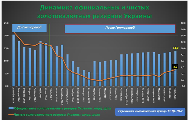 НБУ чистые золотовалютные резервы были на уровне 11,1 млрд. долл, а сейчас мизер даже не смотря на ее жесткую