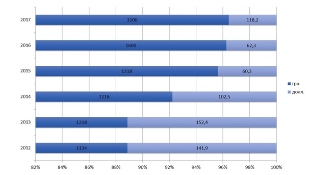 уровня минимальной заработной платы в 2012 – 2017 годах (грн., долл. США)