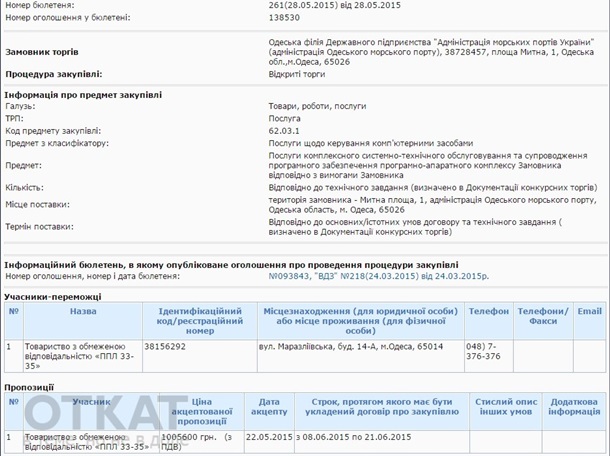 госзакупку услуг для одесского порта выиграл «ППЛ 33-35». За 1 млн 5 тыс