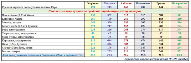 По возможности покупать молоко украинцы близки к жителям Македонии. Тоже самое и в покупательной способности относительно хлеба. Твердых сыров украинцы могут купить за свою зарплату наравне с молдаванами. Зато мяса птицы украинцы на свою зарплату могут купить больше, чем молдаване, албанцы, грузины и жители Македонии, но меньше чем белорусы. В Украине довольно-таки дорогой бензин и очень высокие тарифы за оплату услуг ЖКХ.