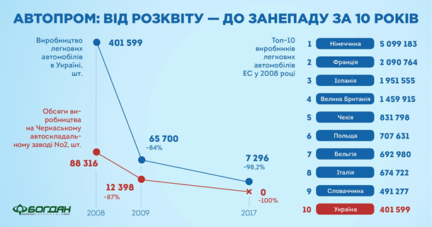 Дані «Укравтопрому» свідчать, що за останні 10 років автовиробництво в Україні скоротилося в 90 разів, тобто майже повністю зійшло нанівець.