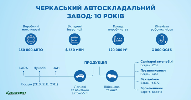 З моменту відкриття 20 червня 2008 року черкаський «Автоскладальний завод №2» залишається єдиним заводом повного циклу, який був побудований за часів незалежності виключно на вітчизняні інвестиції у рекордно короткі строки. Корпорація «Богдан» вклала у його будівництво та оснащення $330 млн. На ці кошти закупили і встановили імпортне максимально автоматизоване обладнання з унікальними комплексами зварювання, лакофарбування та електроосадження. Високий технологічний рівень підприємства забезпечив йому співпрацю з одним із лідерів світового автомобілебудування – компанією Hyundai, з якою був підписаний договір на виробництво моделей Tucson и Elantra XD.