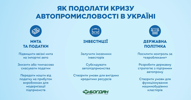 Змінити становище можна лише за допомогою системних змін у законодавстві та державній політиці, скориставшись передовим досвідом розвинутих країн. Для прикладу, у США, щоб захистити автопром, планують запровадити 25% мито на ввезення імпортних машин і запчастин до них. Україні також потрібно замислитися над запровадженням антикризових заходів, які підтримують вітчизняну автопромисловість.