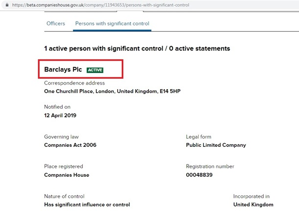згодом змінився засновник. Навпроти Barclays Plc примітка англійською мовою «ceased» - сфальсифіковано. Натомість