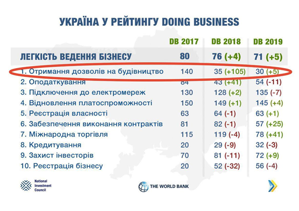 Еще 2 года назад по показателю «Получение разрешений на строительство» в рейтинге Всемирного банка Doing Business Украина была на 140 месте, а сейчас мы на 30 месте, то есть, поднялись на 110 пунктов. В большей степени благодаря этому росту Украине удалось за 2 года подняться в общем рейтинге с 80 места на 71.