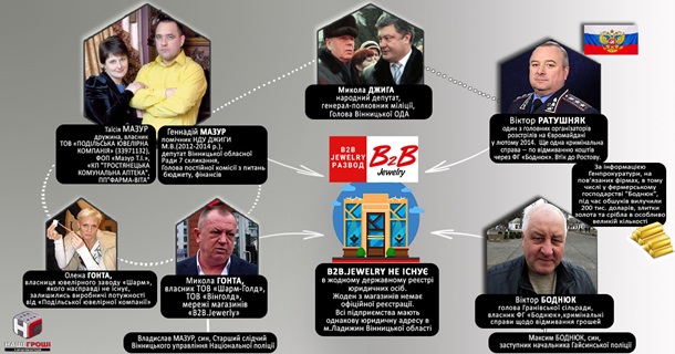 На дружину Таїсію МАЗУР зареєстровані всі підприємства, якими де-факто володіє депутат облради та голова бюджетного комітету Геннадій МАЗУР. Одна з них - «Подільська Ювелірна Компанія», яка і стала базою для створення товарно-фінансової піраміди В2В.Jewelry. Вона ж - завод ювелірних виробів «Шарм», вона ж - ТОВ «Шарм-Голд» та ТОВ «ВінГолд».