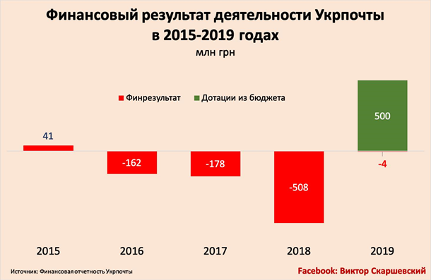 Т.е., это означает, что за вычетом бюджетных дотаций и 2019 год "Укрпочта" закончила с убытком в 4 млн грн (см. График).