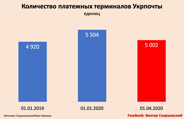 Карантин также повлиял и на сокращение сети терминалов "Укрпочты" – с начала 2020 года количество платежных терминалов сократилось на 502 единицы – с 5 504 единиц на 01 января 2020 до 5 002 единиц на 01 апреля 2020 года (см. График).
