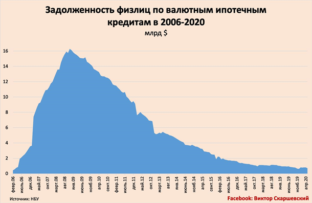 Во-первых, проблема не такая уж и критическая. С октября 2008 года (начала валютного кризиса и девальвации с 5 до 8 грн/$) по май 2020-го, задолженность по валютным ипотечным кредитам сократилась в 23 (!) раза – с $16 млрд. в октябре 2008-го до $700 млн в мае 2020-го (см. График).