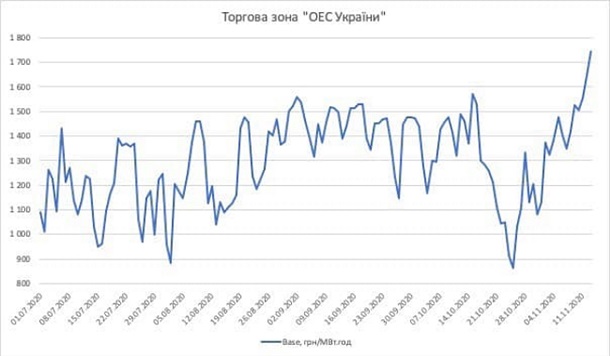 Вчорашня ціна встановила рекорд із початку року - 1,64 грн, а сьогодні (13 листопада) вже новий рекорд – 1,74 грн за кВт-г (базове навантаження або рівний графік).