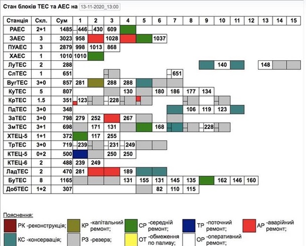 Разом із тим, є непрацюючі блоки і у теплової генерації. Вчора (12 листопада) були заявлені в "аварійний ремонт" три блоки теплової генерації: два блоки Ладижинської ТЕС та 1 корпус Криворізької ТЕС.
