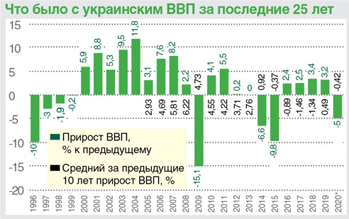Вот из графика “Что было с украинским ВВП за последние 25 лет” видно, что за четверть века только в течение пяти лет удалось превысить темпы роста реального ВВП в гривне больше 7,1% в год. Если брать срок в 10 лет, то такого интервала со средним темпом от 7,1% не было достигнуто ни разу. Более того: самый длинный благополучный период для украинской экономики продлился всего 8 лет – с 2000 по 2007 год включительно.