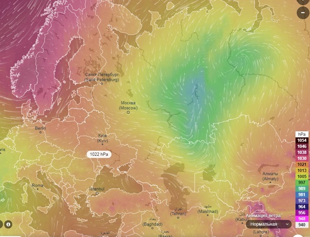 Изобарическая карта наглядно иллюстрирует своеобразные ворота, которые сложились для закачки арктического воздуха. Зона высокого давления над Скандинавией и прибрежными водами, а над Уралом господствует её антипод — атмосферная депрессия. Между ними в широком коридоре циркуляция воздуха складывается вихрями таким образом, что идёт мощный перенос воздушных масс на юг.