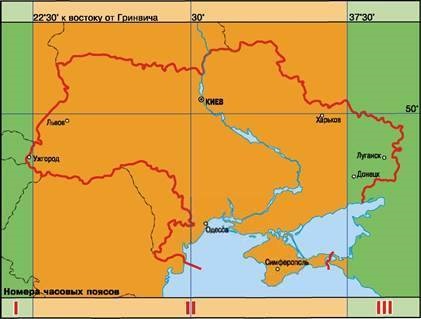 Украина почти вся находится в UTC+2, а Киев расположен в центре этого поясного времени. Теоретически запад Закарпатской области должен быть в UTC+1, а восток Украины — в UTC+3.