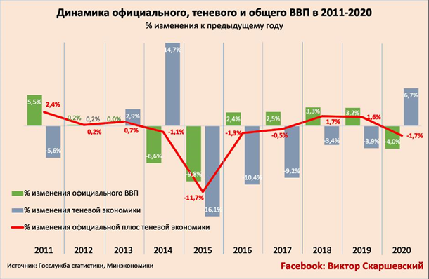 Не стоит забывать, что теневая экономика часто является, среди прочего, компенсатором неэффективной и враждебной экономической политики власти по отношению к официальной части экономики, а также смягчает последствия экономических кризисов. Например, как в 2014 и 2020 годах – когда при резком падении официальной экономики, увеличивалась теневая, что сгладило падения экономики с минус 6,6% до минус 1,1% в 2014 и с минус 4% до минус 1,7% в 2020 (см. График).