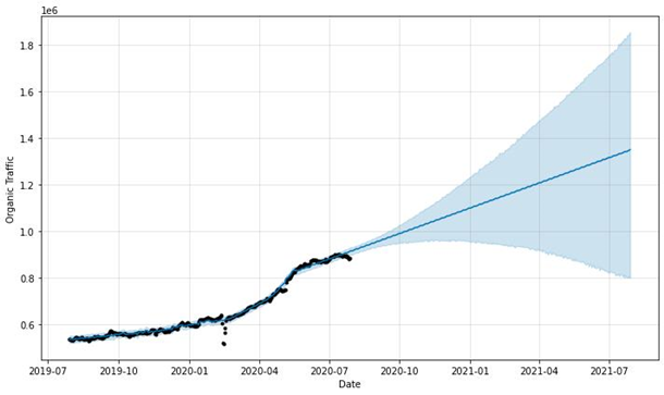 Для начала мы выделяем сегмент поисковых запросов и их суммарную частотность. Если в качестве отправной точки для составления прогнозов взять текущее состояние сайта, то это будет одной из самых больших ошибок. Очень важно знать, какой была динамика изменения органического трафика за последние год-два. Тогда можно будет увидеть периоды роста/просадки продвижения и разобраться, почему это происходило.