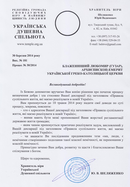 Українська Душевна спільнота почала процес визначення добра і зла № 30/2014 стосовно декларації під заголовком «Правила суспільного життя, які маємо реалізувати в новій Україні», яку поширив проповідник християнства Блаженніший Любомир (Гузар), Архиєпископ-емерит Української Греко-Католицької Церкви.Наводимо повний текст рішення.