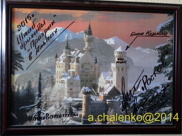 На противоположной стене репродукция знаменитого баварского замка Нойшванштайн, выстроенного в 19 веке по заказу одного из самых загадочных королей Европы Людвига Второго. На картине фломастером сделана надпись «2015 год. Штаб бригады «Призрак» в Альпах».