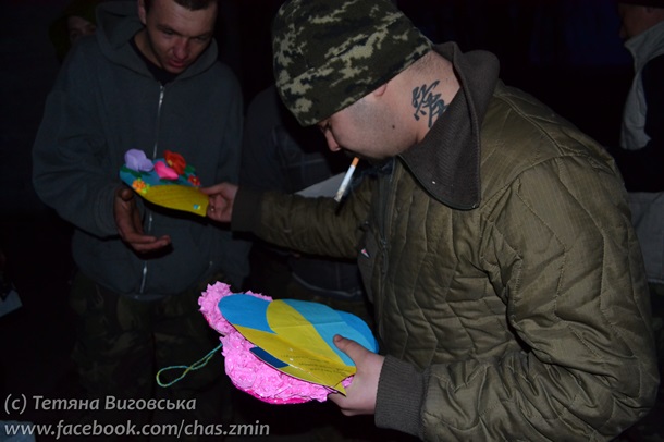 А от і наші давні знайомі зенітники. Нас чекають. Розвантажуємо автомобіль, і не можна вгадати, чому вояки радіють більше, продуктам, білизні чи дитячим поробкам. Але варто лише було побачити, як "розліталися" поробки по огрубілих руках, а обвітрені обличчя розпливалися у щасливих посмішках. Наша армія справді народна і солдати по дитячих малюнках бачать за що вони воюють. За мир, за життя без "русскаго міра" з його "Бєсами" й Мозговими. Далі йдемо в тимчасове військове житло.