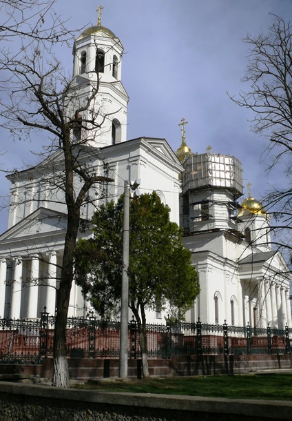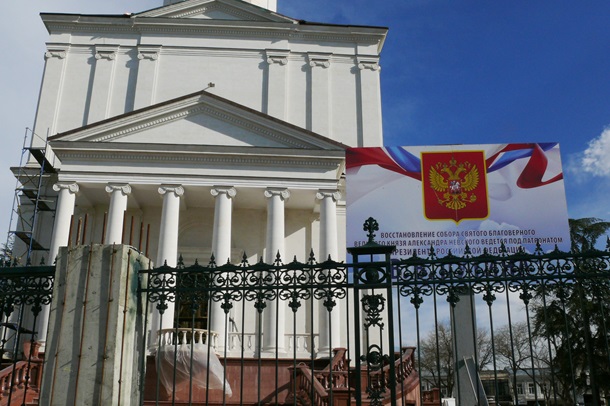 Тем более что новое очень хорошо видно на контрасте со старым. Как, например, вечный недострой в виде храма св. Александра Невского в Симферополе, ныне растущий как на дрожжах. Как гласит табличка – под патронатом лично президента Путина.