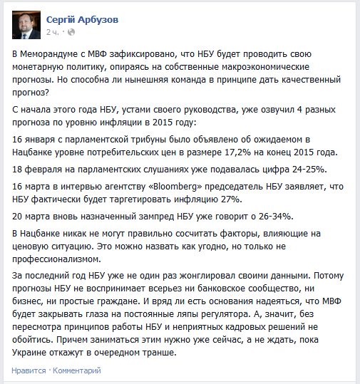 Об этом написал на своей страничке в ФБ экс-глава НБУ Сергей Арбузов.