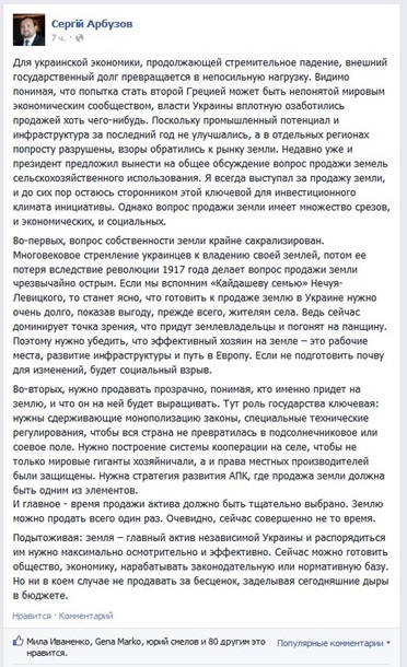 поводу написал экс глава НБУ Сергей Арбузов: «Подытоживая: земля – главный