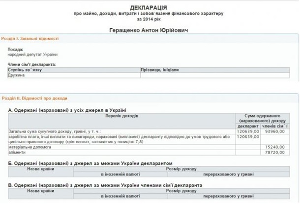 Согласно декларации за 2014 год все доходы Геращенко составляет зарплата. При том, что депутатом он