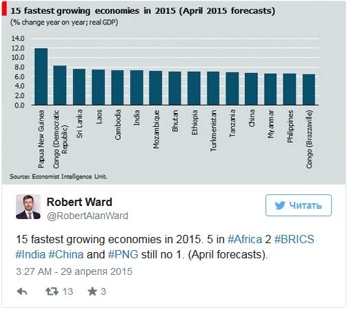 "15 самых быстрорастущих экономик в 2015 году. 5 - в Африке 2 – в БРИКС, а также Индия, Китай, а ПНГ (Папуа - Новая Гвинея, - Ред.) - до сих пор номер 1. (апрельский прогноз)", - сказано в сообщении эксперта.