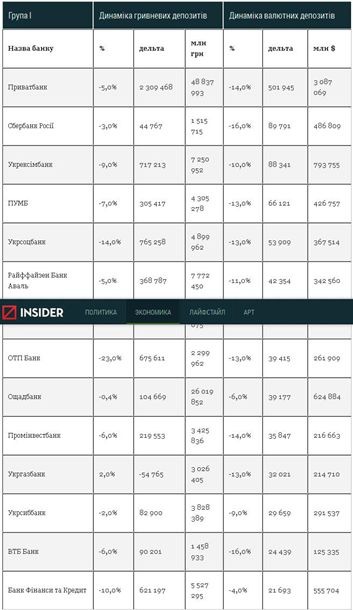 В первой группе банков наибольший отток депозитов состоялся в "Приватбанке": вкладчики вынесли полмиллиарда долларов и 2300000000 грн. "Сбербанк России" потерял в валюте $ 90 млн, в гривне - 44 млн.