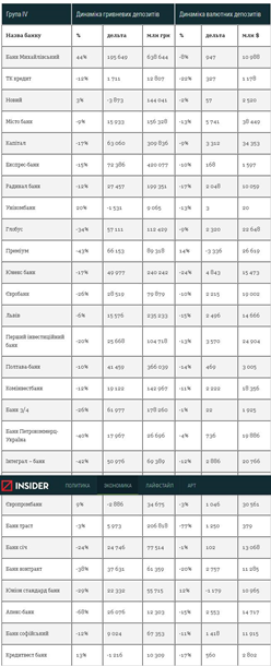 В четвертой группе банков наибольший отток валютных депозитов был в "Город Банка" нардепа Ивана Фурсина, партнера Дмитрия Фирташа. За первый квартал вкладчики вынесли из банка $ 5700000. Гривневый портфель уменьшился на 16 млн грн. В гривне наибольший отток был в "Экспресс-банка" - минус 72300000 грн. В то же время "Банк Михайловский" закончил первый квартал по гривневым депозитам в "плюсе". Прирост составил 44%, или 195 600 000 грн.