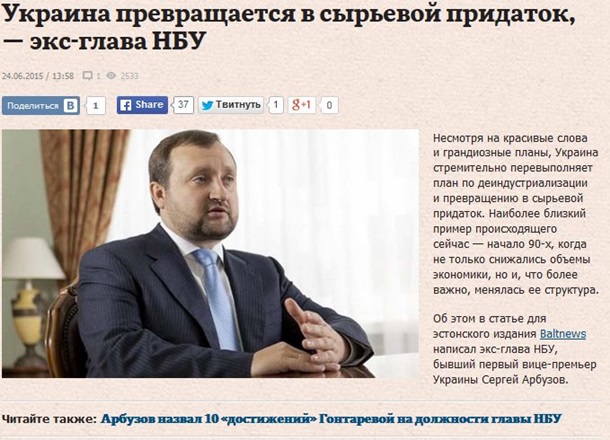 Поэтому то, что происходит сейчас, это не переориентация трудоемких и наукоемких производств на новые рынки. Это их потеря. И даже многократный рост экспорта рапса в ЕС никак здесь не поможет. Ни через десять, ни через двадцать лет», - написал в статье для балтийского издания Baltnews бывший глава Нацбанка Сергей Арбузов.