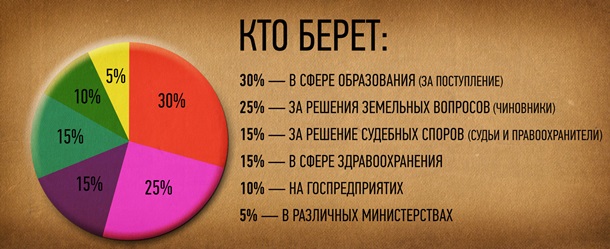 В масс-медиа регулярно проскакивают статьи с шокирующими суммами взяток. Лидируют по лумпсуму «слов благодарности» — чиновники «решающие» земельные вопросы. Также, незаконно обогатиться, пользуясь служебным положением, пытаются судьи, милиционеры, прокуроры, меры небольших городов, и даже врачи и учителя. К слову, последние — занимают первое место в антирейтинге по количеству взяток.
